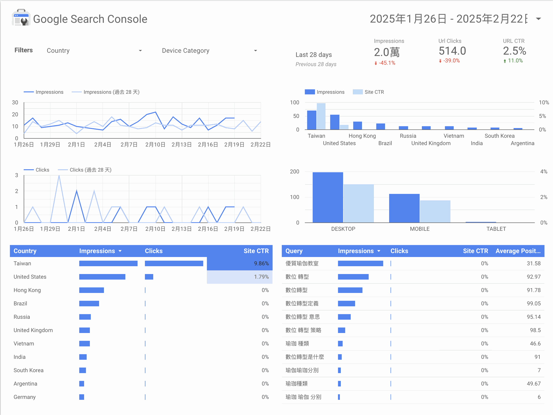 提供即時網站流量追蹤、來源分析、關鍵字排名與點擊率,讓你知道哪些內容有吸引力、哪些頁面在轉換上卡關。看得懂、用得上的數據,幫助你精準優化內容與廣告策略。