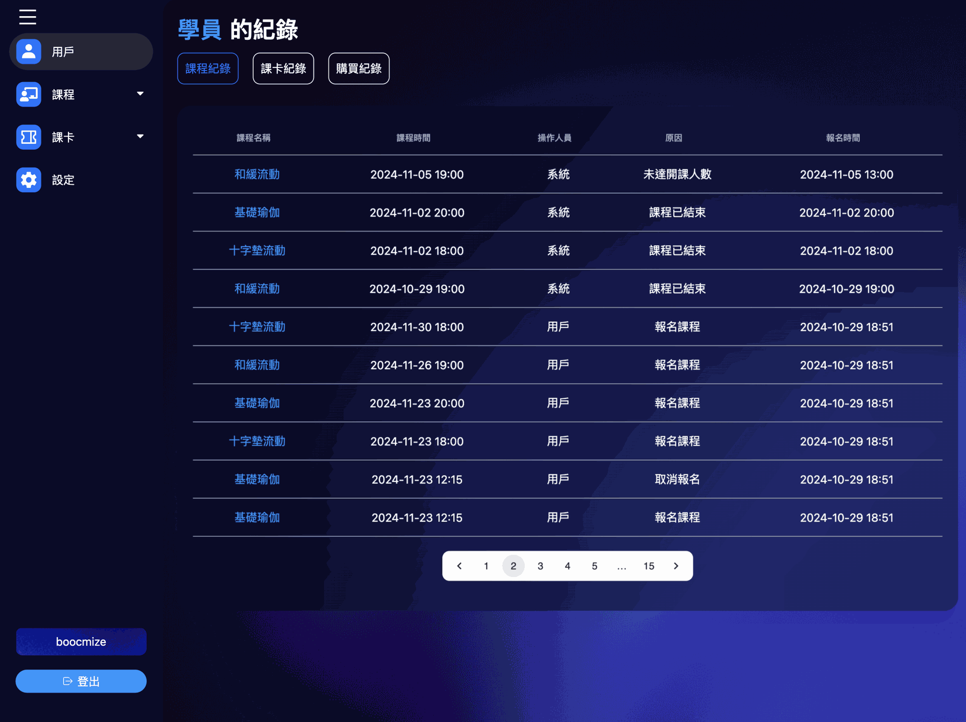 系統自動記錄每位學員的課卡購買與使用狀況,含消耗次數、剩餘效期與付款方式。預約紀錄也完整保存,讓管理員快速掌握學員出席與消費狀況,服務更到位。
