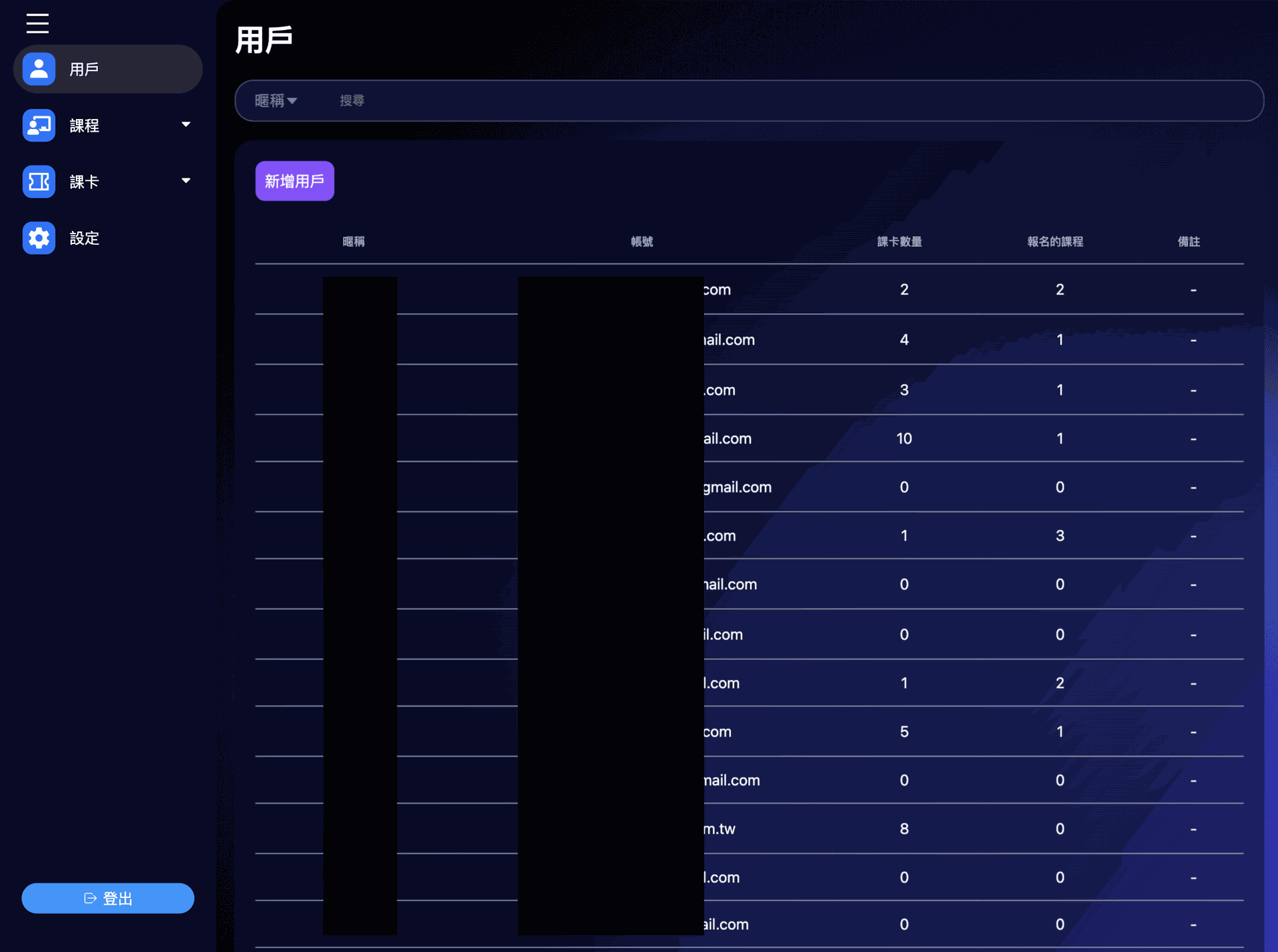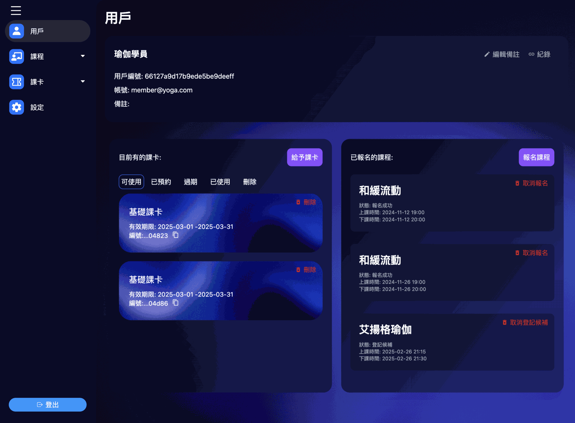 可用姓名、ID 或帳號快速搜尋學員,查看報名課程、課卡使用與備註說明。管理員也能手動新增會員與個性化註記,記下特殊需求或身體狀況,真正做到有溫度的服務。